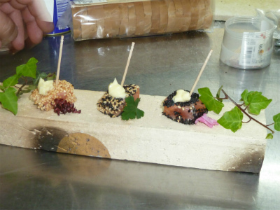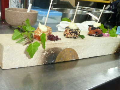 中央の懐紙の部分に 近くの山で採れる 山菜の天婦羅を5品のせます。山菜の