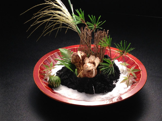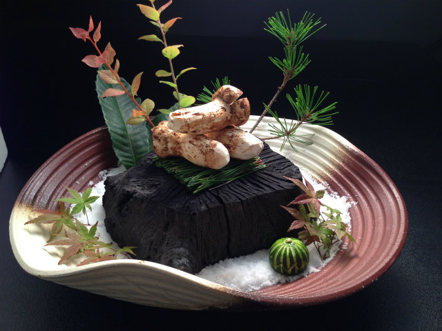 とても綺麗な盛り付けだと思います。大皿に 炭を使って インパクトがあると