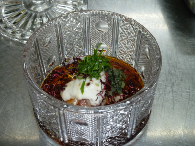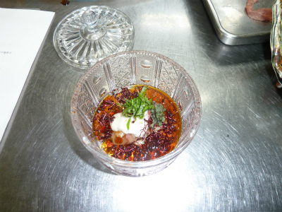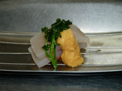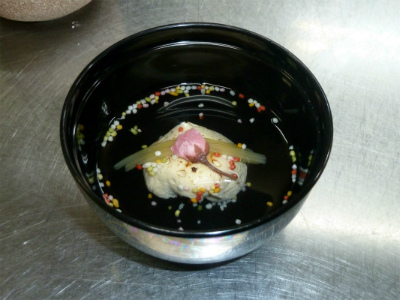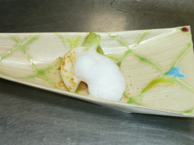 「うるいと蕪」です。蜆のスープを泡状にしてかけ 最後に 粉醤油を振り掛け