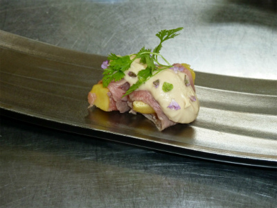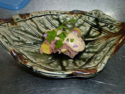 「マンゴー上州牛巻き」です。上にかかっているソースは胡麻味のソースです。