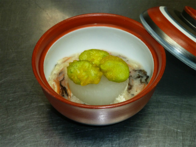 「春大根 春香餡」です。大根の上には 薄衣で揚げた 空豆を乗せます。