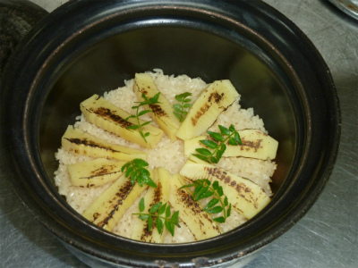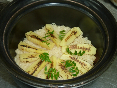 「焼き筍御飯」筍は 焚いてから 焼目を付けます。
