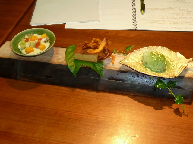 白い器から 竹を取ってきて バーナーで焼き目をつけ その上に デザートを