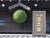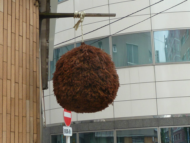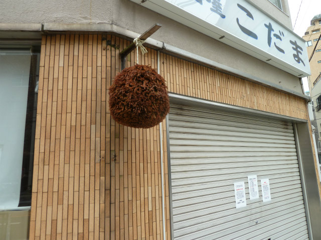 近くの酒屋さんに かけて有る杉玉です。新酒が出来上がると 画像に有る「青