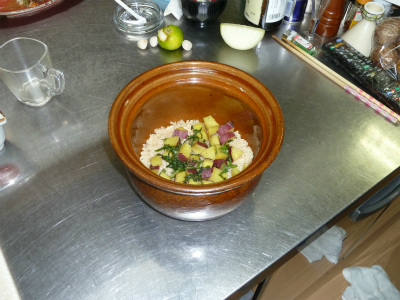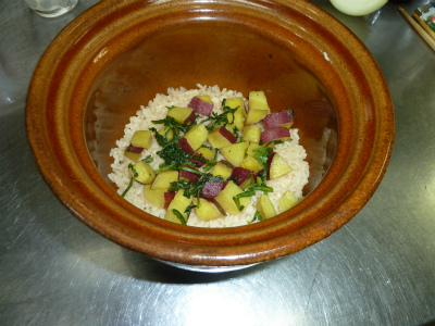 「薩摩芋と春菊の焚き込みご飯」です。試食で 女将さんには 大好評でした!!