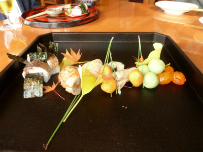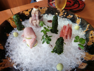 「銀鯖寿司炙り、射込み軍鶏ロック酒盗焼き、子持ち槍烏賊旨煮、卵黄西京漬け
