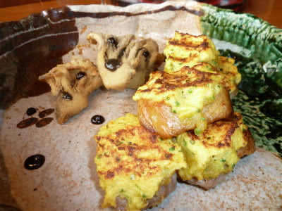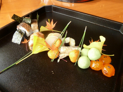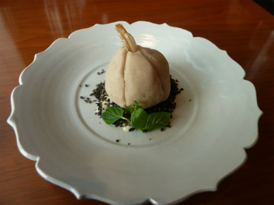 「熟成黒大蒜と蒸し栗の茶巾絞り 黄身ソース」