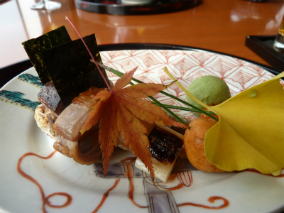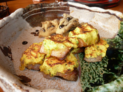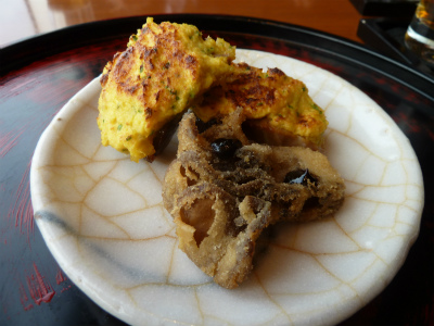 「鰤浅黄焼き 舞茸フライ 赤玉ソース」盛り付けが お洒落でした。取り分け