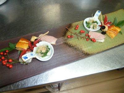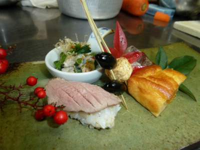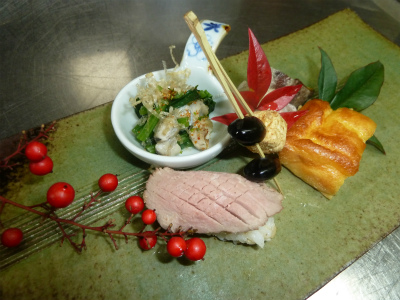 「寒蜆と法蓮草のお浸し」「金柑伊達焼き」「栗渋皮煮白扇揚げ」「鴨寿司」