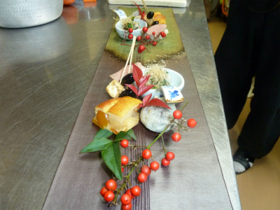 「黒豆とクリームチーズ粉節和え」です。当日は 梅の枝と紅白半紙を使って盛り
