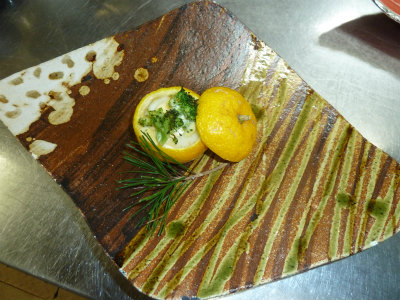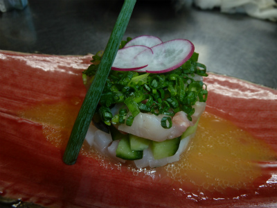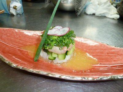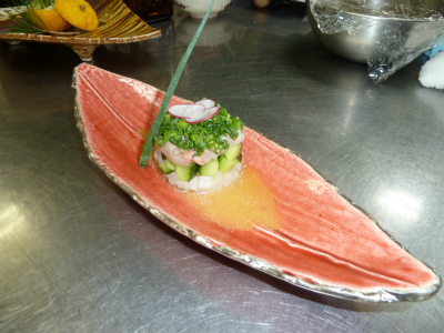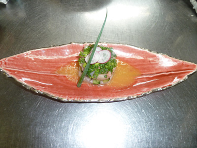 「ブラウンタルタル 蜜柑ドレッシング」です。本番は シブレットをつけま