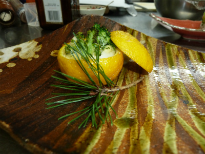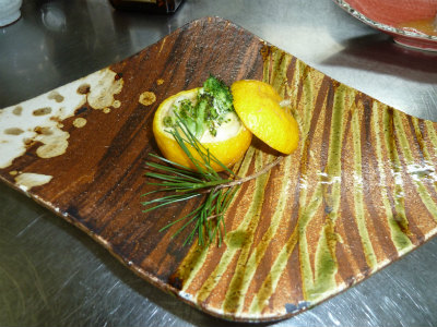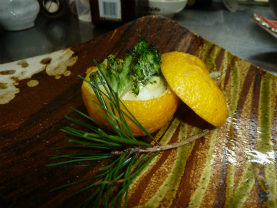「和風柚子グラタン」です。中身は 伝法焼きです。本番の 柚子二回り大きな