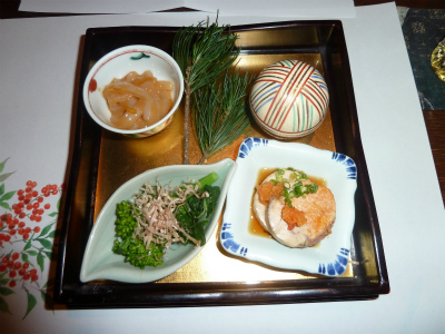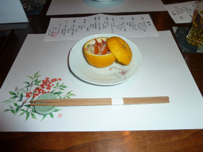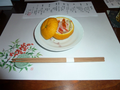 「五色膾 柚子釜」京人参 大根 蟹 干し柿などが入っていました。
