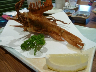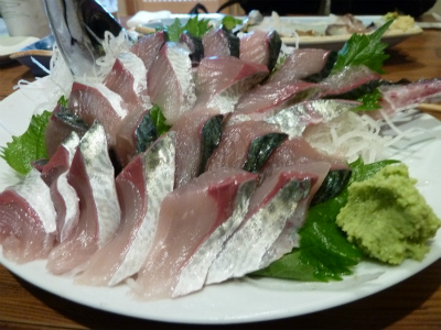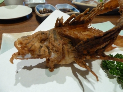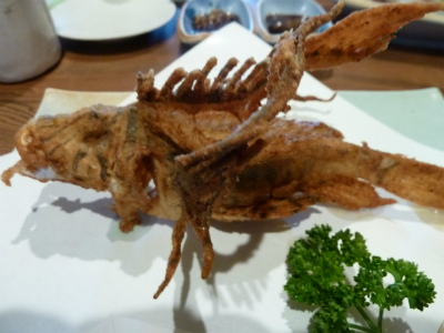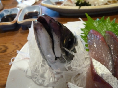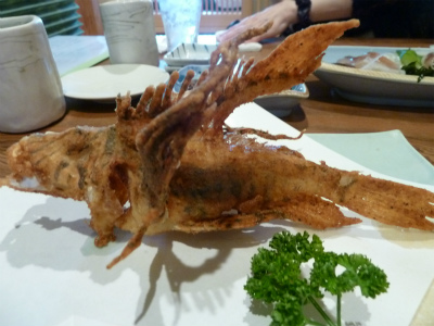 昨日の 魚料理は「みのカサゴの唐揚げ」「生烏賊姿造り」「鯖の刺身」「いさ