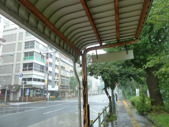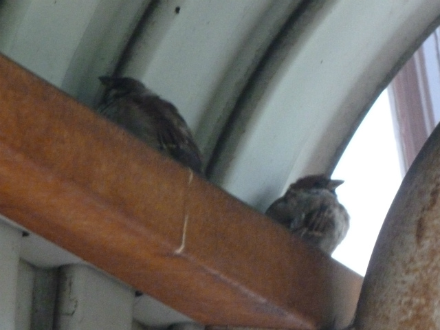 都内移動の為 バス停に行くと 雀が雨宿りしていました。2羽とも 寒そうでし
