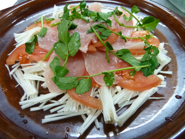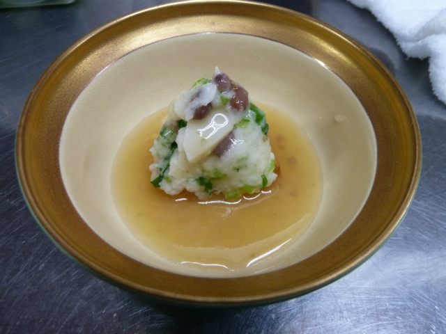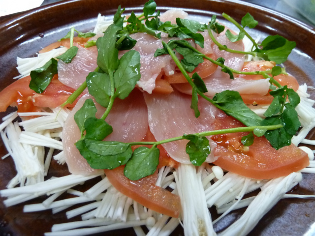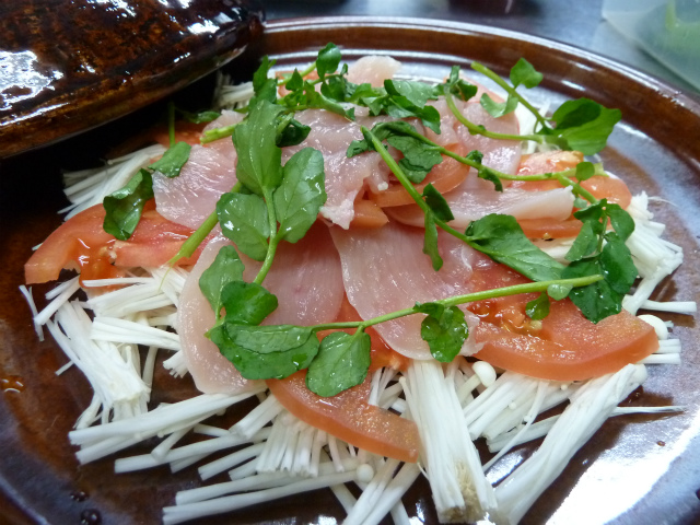 「地鶏と赤茄子の酒蒸し」柚子胡椒で 食べて頂きます。