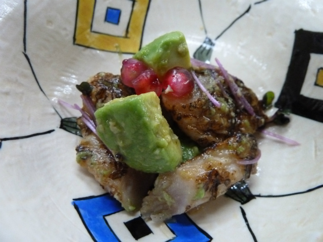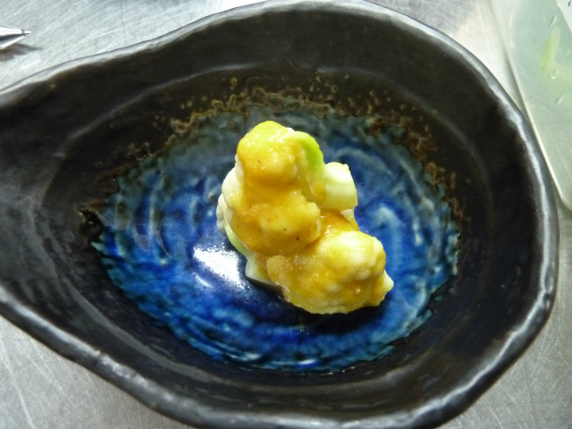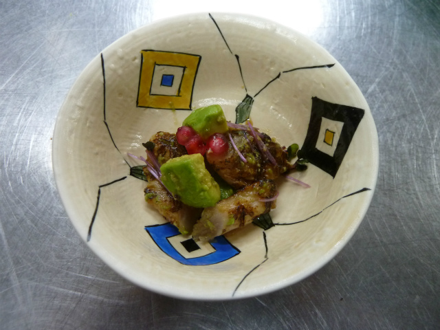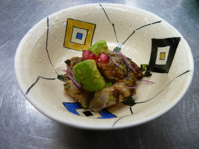 「風干し笹見とアボカド 山葵酢」です。本当は アボカドの皮を器代わりに使