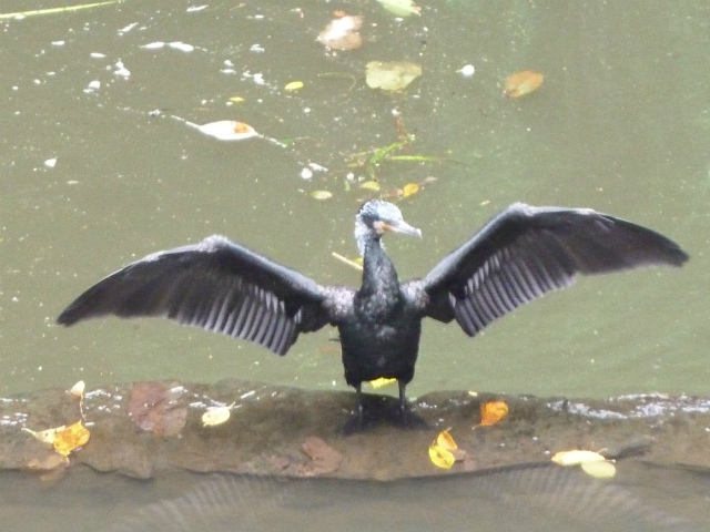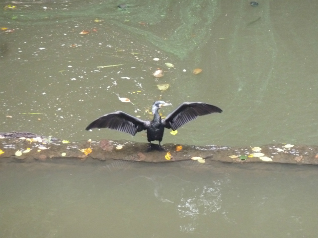 移動中 川を見ると 鳥が!!鶏の種類はわかりませんが 羽根を広げて リラッ