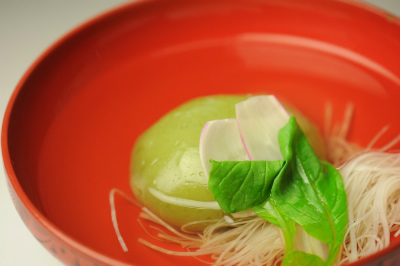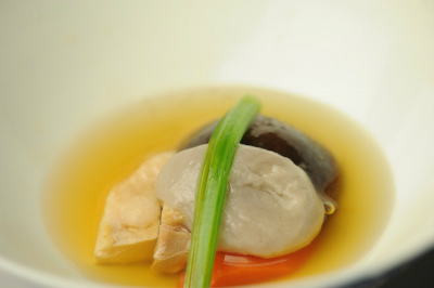 杉正農園より季節の野菜とお出汁の合わせ椀「小松菜、あやめ雪、里芋、紅白ミ
