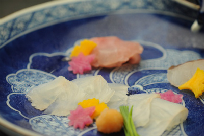 「薄造り(カワハギ又は、ゴソ)、芽葱、紅葉おろし、ポン酢」都心ではなかな