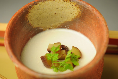 「天城軍鶏、中伊豆原木椎茸、磐田産海老芋、軸ほうれん草」いよいよ海老芋の