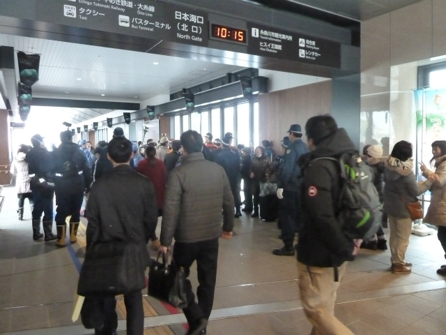 糸魚川駅に着き 改札口へ行くと カメラクルーや住民や内閣府と記入のある