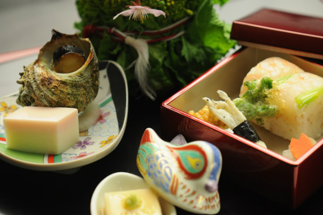 雛月の菜「海老手網巻き 姫サザエ利休焼き 花見る貝 菱寄せ さくら豆腐
