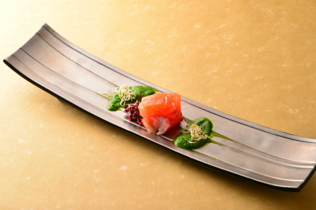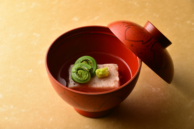 献立内容は 赤城地鶏山椒焼き、新茶の天婦羅、独活頃胡麻かけ、鋳込みトマ