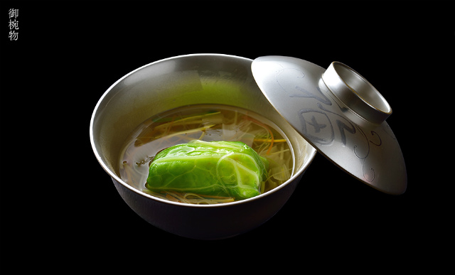 包んだ海老真丈を茶巾にしたもの 胡瓜で番傘に見立てたもの、空豆を雨蛙に見立