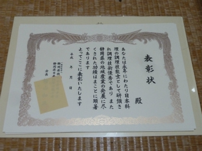 今回も 和心紡関連の調理人で頑張っている若い子にと 表彰状をいただいてき