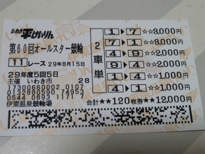 が なんと 私の買った 車券があたりました!!少額ですが ついてました!!