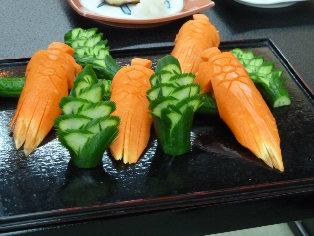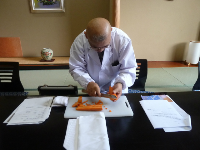 野菜使っての剥き物3品を 披露。檜山会長は 日本料理業界では 剥き物の第一