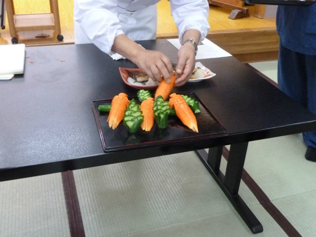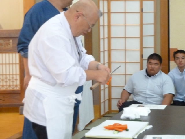 作れる料理2品の実演と 野菜を使っての剥き物3品を黄綬褒章料理人の檜山