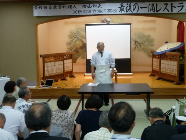 司会者と 檜山会長で トークショーです。檜山会長が 料理人を目指したきっ
