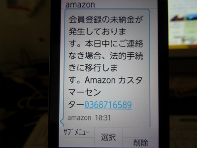 アマゾンを名乗る所から「会員登録の未納金が発生しております。本日中にご