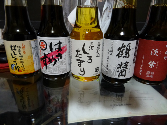 各地の醤油が100mlの瓶で売っていて 試食も出来ます。山水の社長と試食して