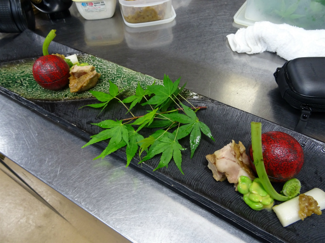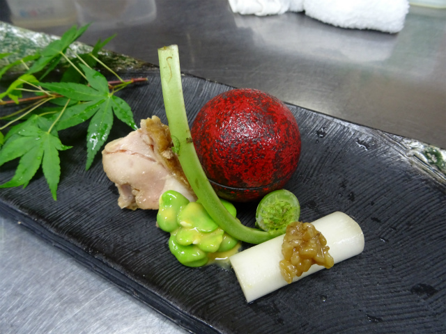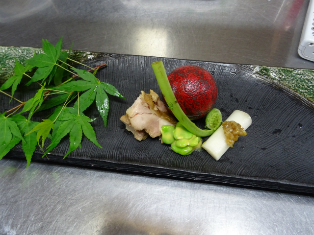 献立内容は 地鶏雲助焼き 新茶ピリ辛和え 山独活諸味添え 空豆黄身酢がら