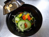 季節の野菜を小角に切り 紫陽花に見立てて 椀種にしています。