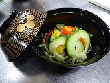 お造里は お客様に大人気の 器に 「地鶏ささみと梅雨野菜 葱醤油」です。