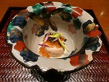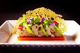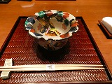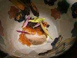 先付は 「秋鮭の真薯和栗と胡瓜鋳込み湯葉包み」豆乳ソースでした。