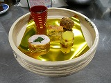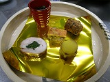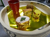 寒蜆と法蓮草のお浸し 地鶏八幡有馬焼き 五目黄金豆腐 薩摩芋檸檬金団