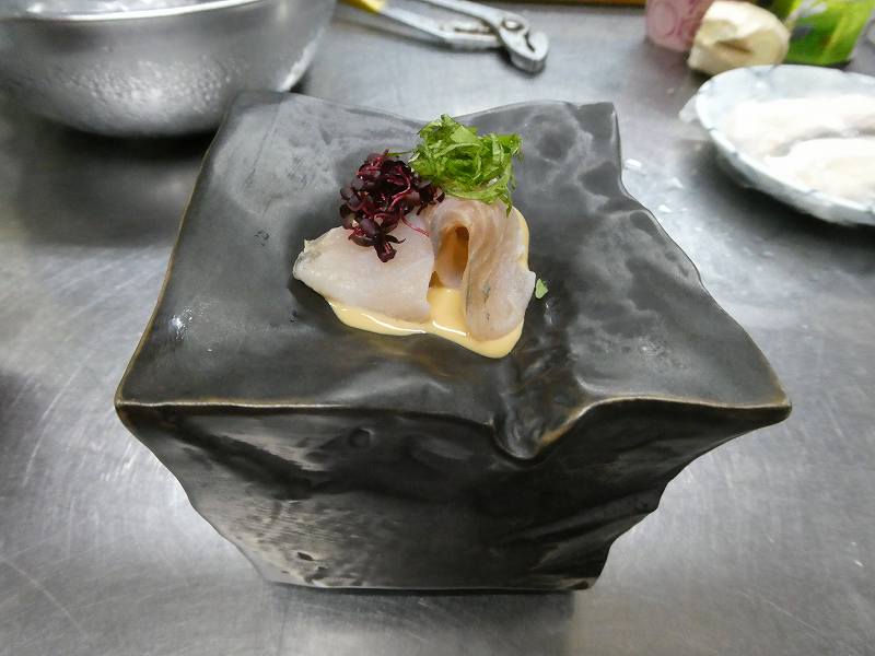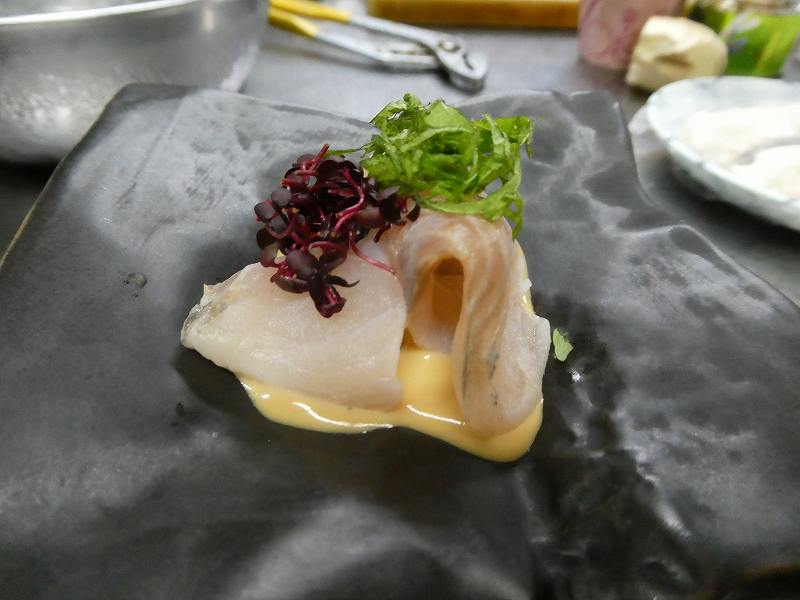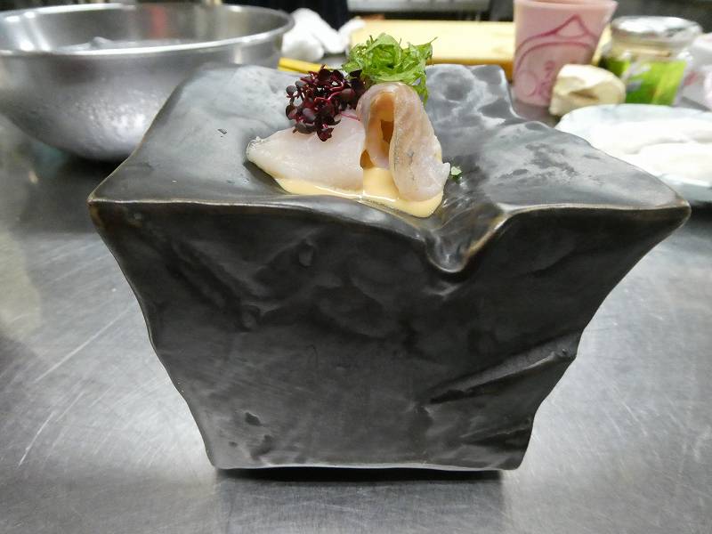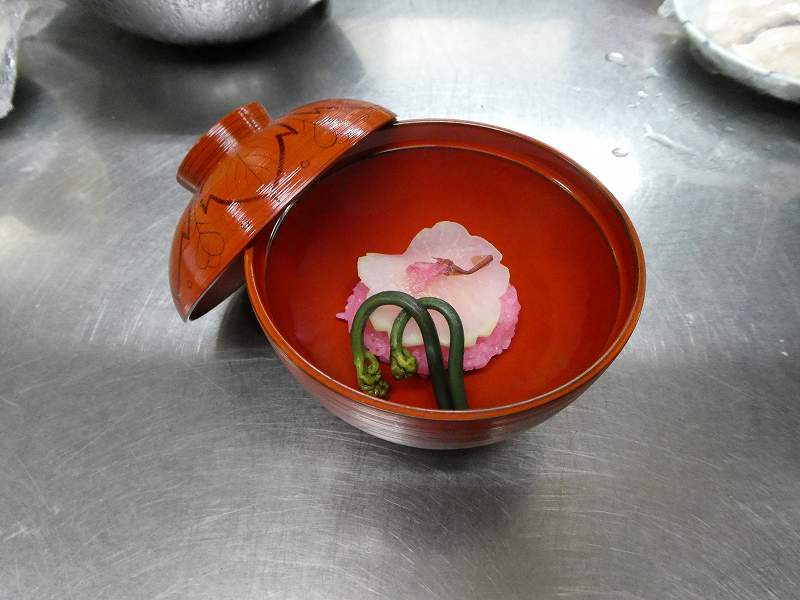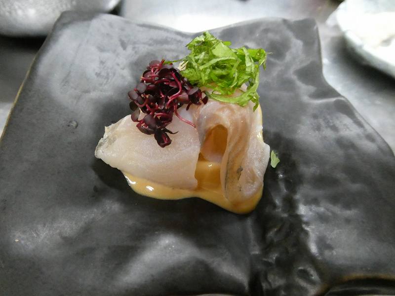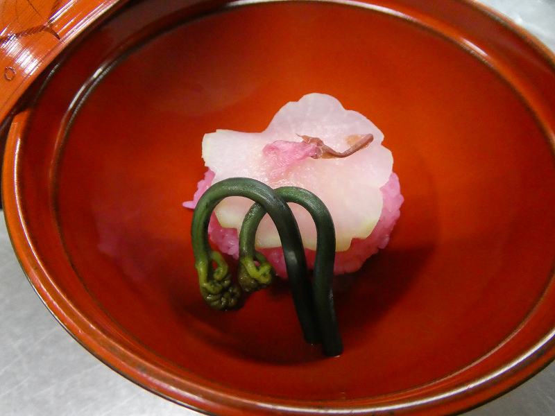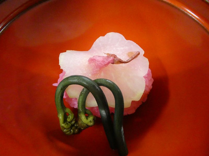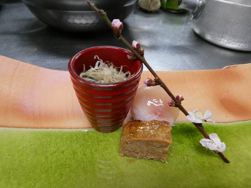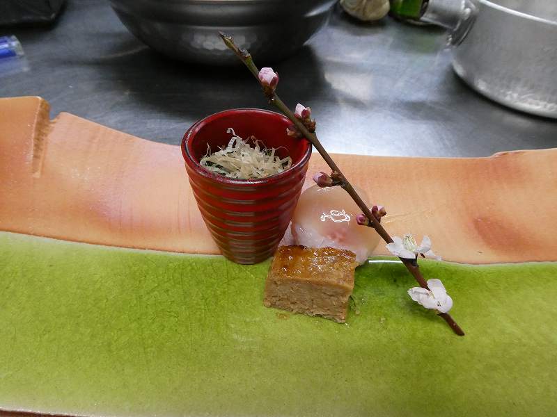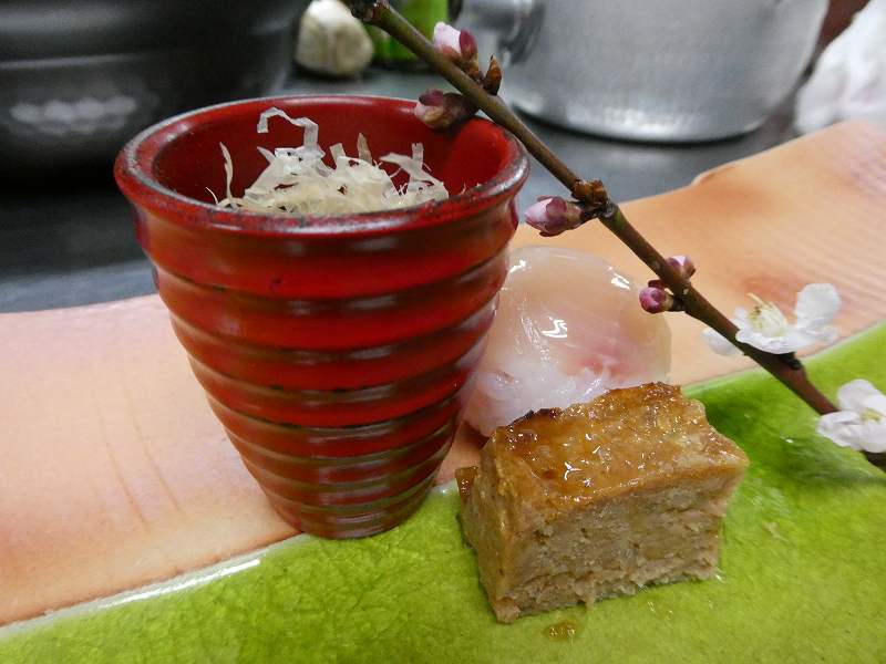 3月の先付は 花山葵醤油漬け 松風蝋焼き ブラウンぼんぼり寿司の 3種で