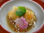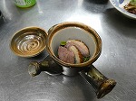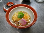 4月の先付は 「地鶏のささみと田芹の辛し和え」です。