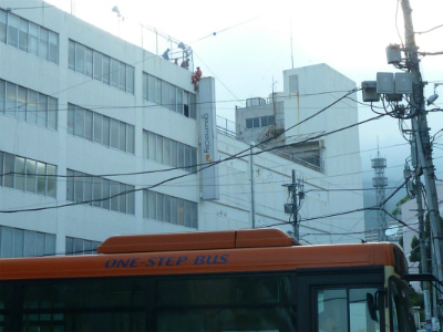 上を確認したところ 大きな看板が取れかかっていました。落ちたら大惨事