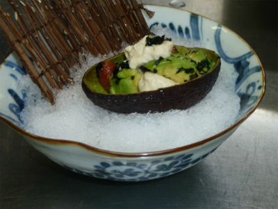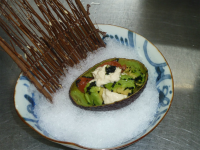 ギンヒカリと生湯葉とアボカドの川海苔醤油和えです!!当日は 椿の葉と凧を