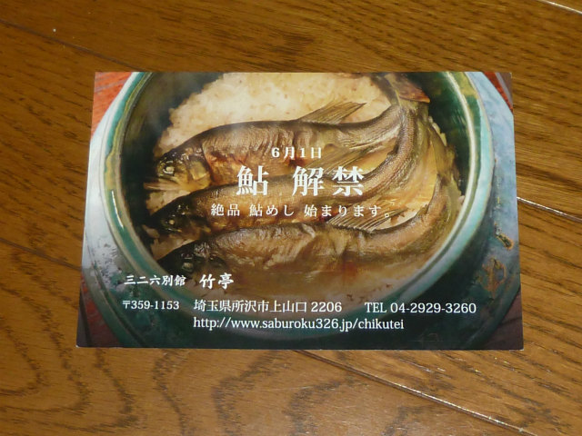 さぶろく別館「竹亭」様より 鮎を始めるとの 葉書きが届きました。和心紡の