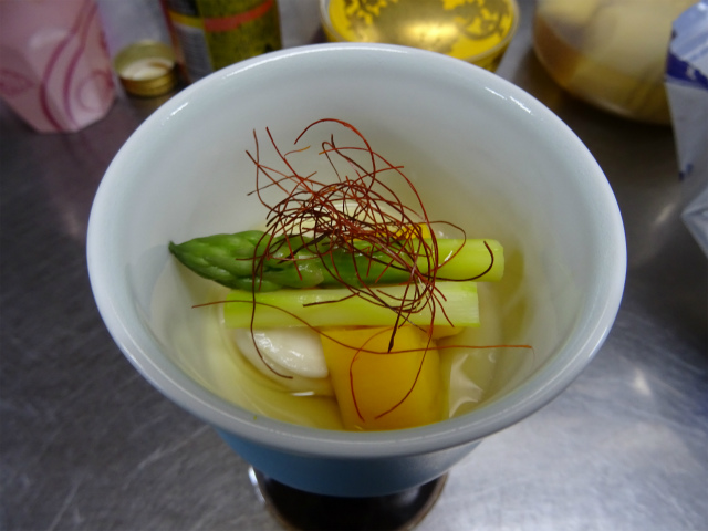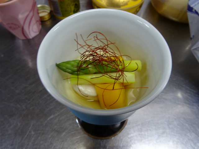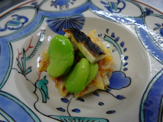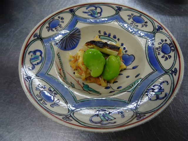 新玉葱、焼き白アスパラ、空豆を 和え物にした料理です。