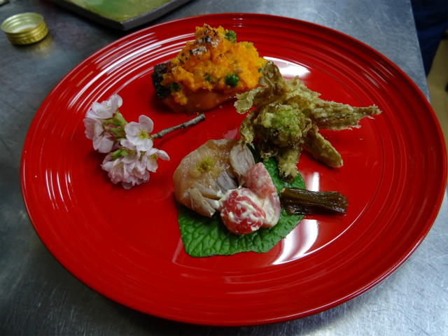 ギンヒカリの菜種焼き 蕗の薹天婦羅 漬けささみ 蕗田舎煮 プチトマト白和