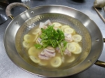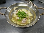 鶏と昆布で出汁を取り 春野菜と鶏肉で鍋に仕上げました。調味料は 極力少な