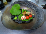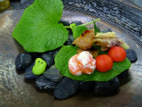 「雨蛙天豆、鴨味噌焼き、茗荷薄衣焼き、枇杷チーズ和え、トマト寿司」です。